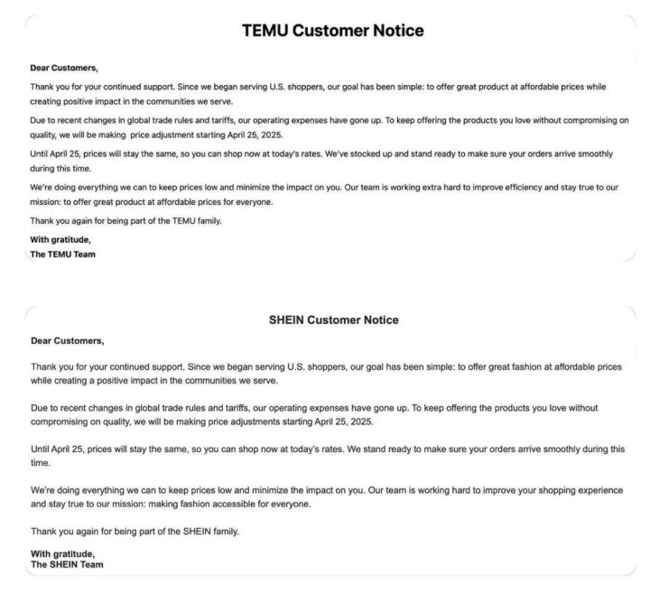据财联社消息,电商平台Temu、Shein均已公告称,由于“近期全球贸易规则及关税变动”,运营成本上升,将从4月25日开始实施价格调整。除了关税本身,特朗普也下令从5月2日起终止800美元以下小额包裹免征关税的政策。